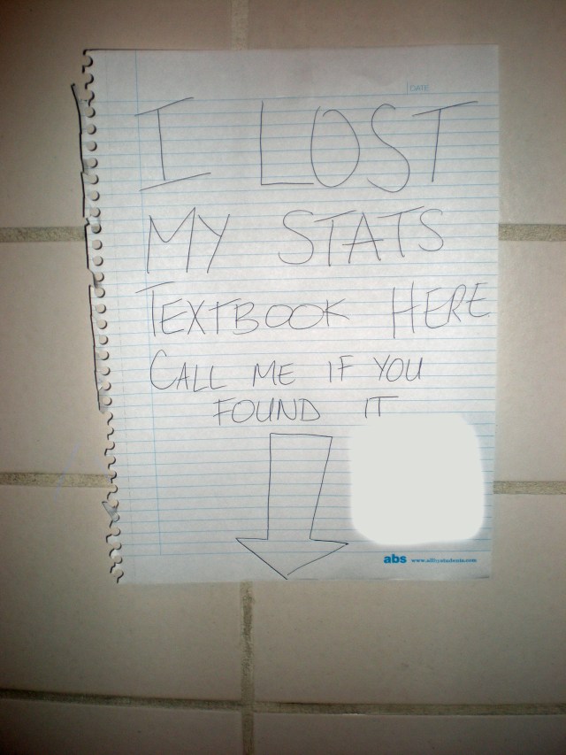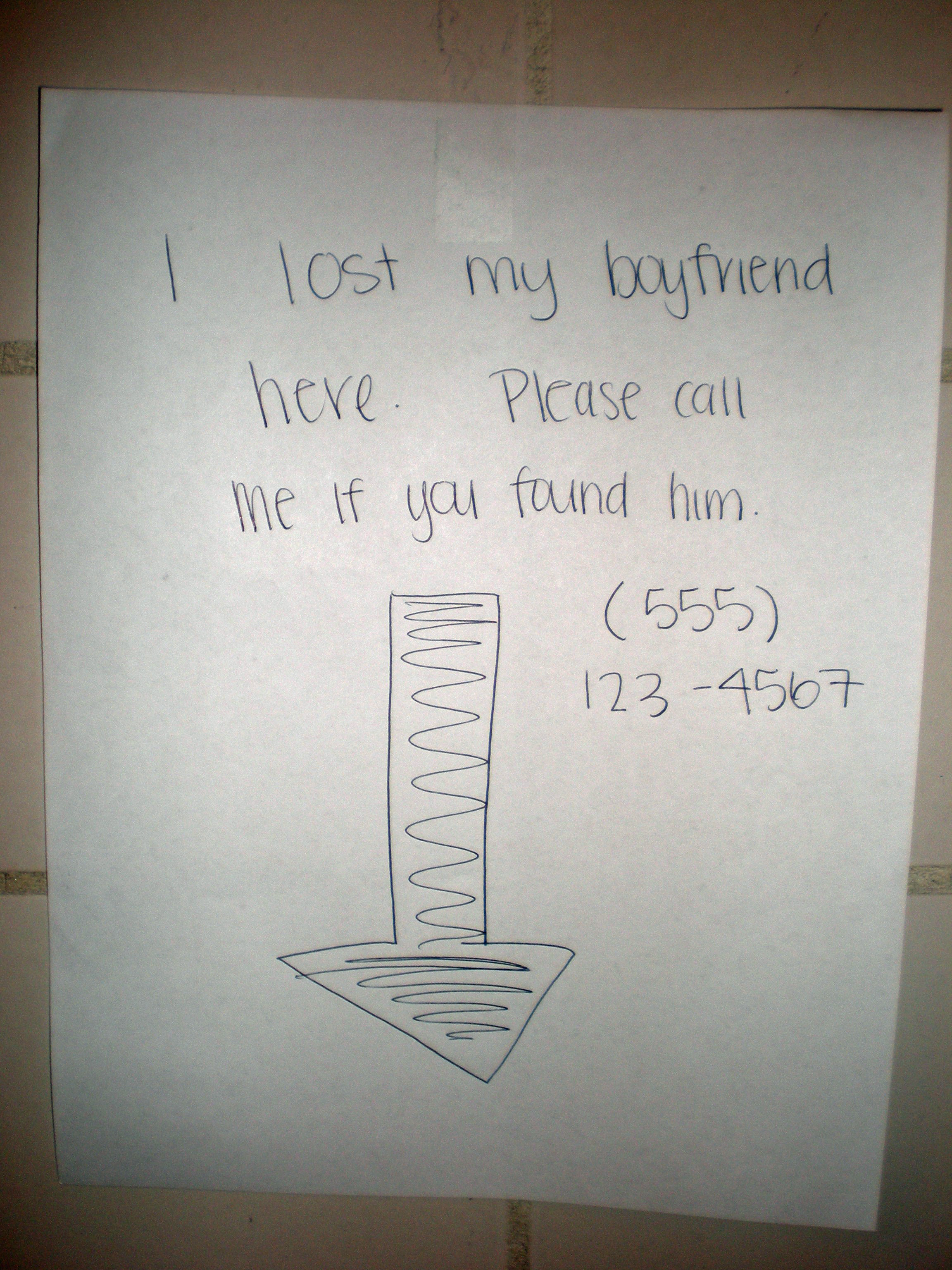 Posted on:March 8, 2010May 7, 2014 So I was wandering around campus when I saw the following note: Ignore the big white splotch – I’m just covering the number Of course, I had to laugh at this. And being me, I had to add a note of my own: When I showed the pics to my hubby, he was like, “You should have written: I lost my boyfriend. If you found him, you can keep him!” Rate this:Share this: Click to share on X (Opens in new window) X Click to share on Facebook (Opens in new window) Facebook Click to email a link to a friend (Opens in new window) Email Click to print (Opens in new window) Print Like Loading... Related News